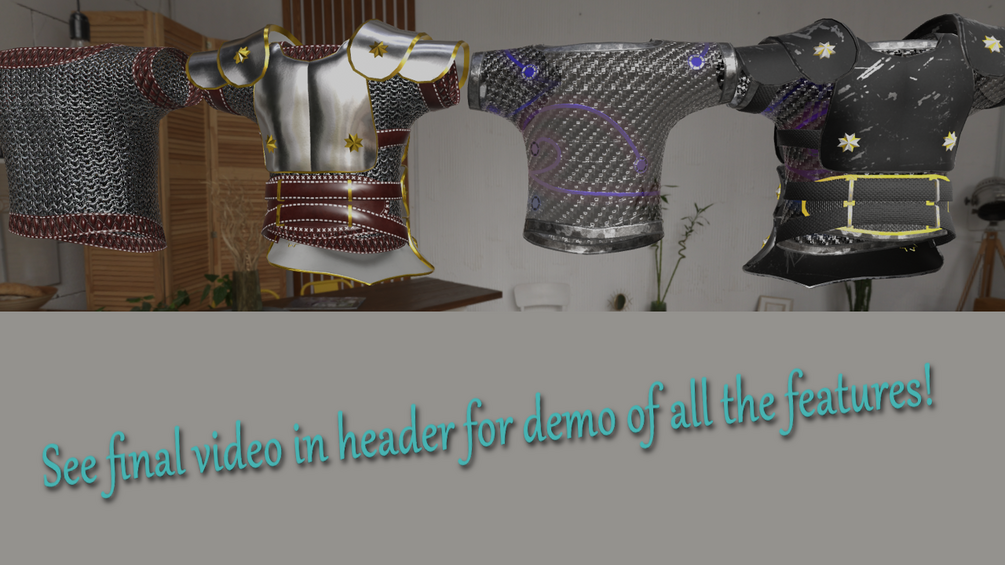 Realistically styled plate armor. Includes 8 metal plates that stay stiff and move with the avatar. Some clipping is expected when using these non-bending metal plates, see video for movement example. Every plate can be toggled with a blendshape. Most parts have built in audiolink. RGB color masking and Theme Color is being used to support color customization, and a radial menu lets you turn on color changing and alter them at will in game. This was a fun project to try and make some realistically moving plate armor without having the plates deform with bone movement. I hope you enjoy!