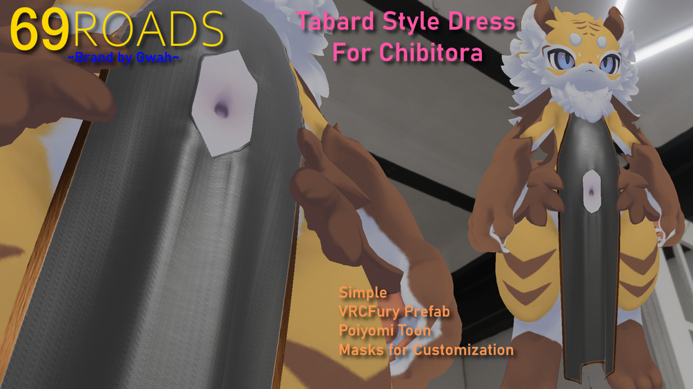 This asset is a simple tabard style dress for the Chibitora avatar. It has a loop around the neck and falls over the chest and belly with a cutout hole for easy viewing of the belly button.